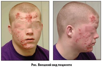 В КДИБ пациент отметил, что сыпь началась с нескольких пузырьков на лбу и щеке, затем распространилась почти на всю правую половину лица. Высыпания не сопровождались зудом, но были болезненными. Аллергических реакций на лекарственные препараты в анамнезе нет. Вакцинирован согласно современному календарю вакцинации. Пациент физически активен, посещает секцию борьбы, успешно готовится к предстоящему соревнованию. За последнее время не отмечал потери веса, головной боли, головокружения, фотофобии, лихорадки и простуды. Семейный анамнез без особенностей.
